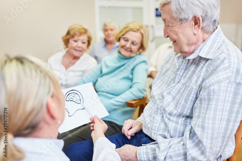 Gruppe Senioren mit Psychotherapeutin in einem Gesprächskreis im Altenheim
