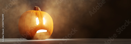 Glowing carved Halloween pumpkin in a dark eerie setting