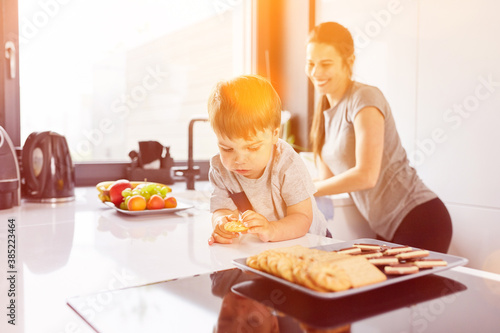 Child with a sweet tooth in the kitchen while snacking on cookies