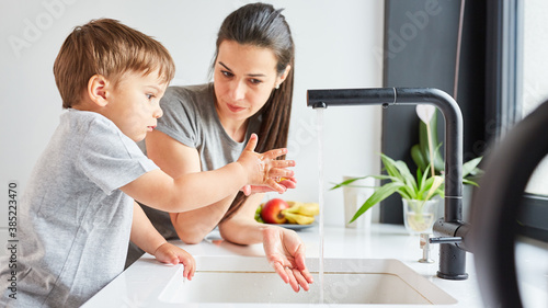 Glückliche Eltern heben Sohn hoch als Familie zu Hause