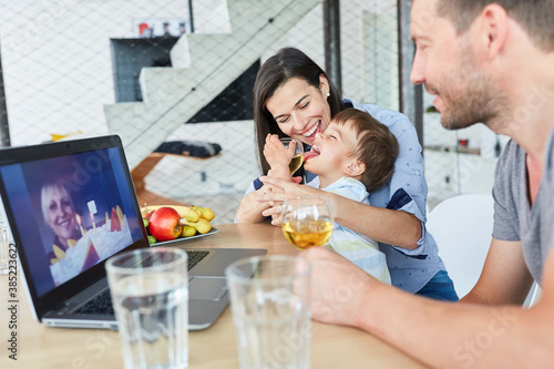 Family and child in video chat with grandmother