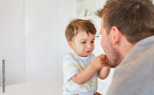 Glückliche Eltern heben Sohn hoch als Familie zu Hause
