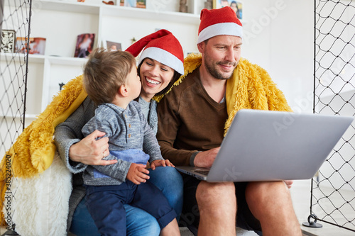 Familie mit Kind macht Videoanruf zu Weihnachten