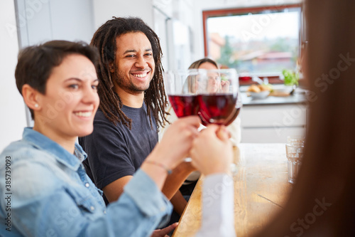 Happy friends at home in shared flat toast with glass of red wine