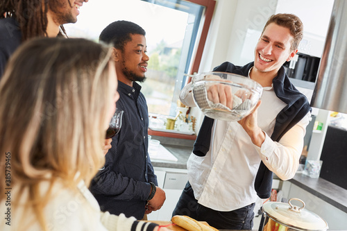 Lachende Freunde beim Abtrocknen von Geschirr in Küche