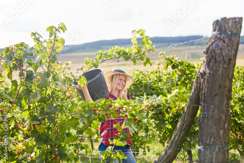 Frau als Erntehelfer bei Traubenlese im Weinberg