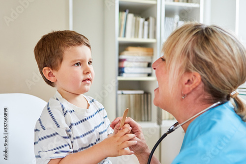 Kinderärztin beim Abhören von Lunge mit Stethoskop