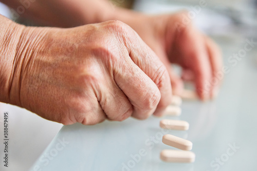 Pflegehilfe und Senior vor Tafel mit Muskel Armen als Pflege Konzept