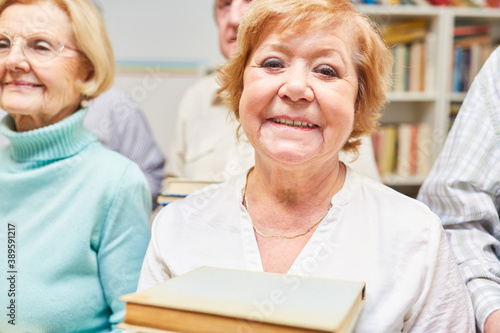 Gruppe Senioren mit vielen Büchern in der Bibliothek der Seniorenresidenz