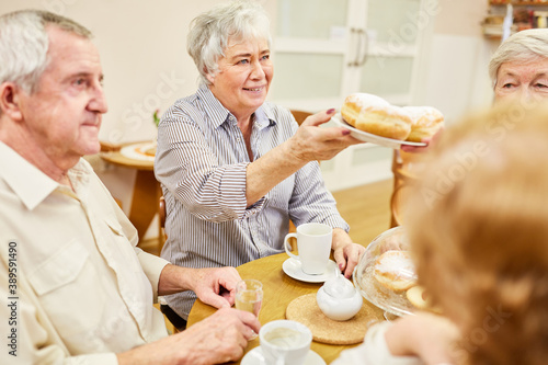 Senioren Gruppe beim Kaffee trinken und Kuchen essen im Seniorenheim