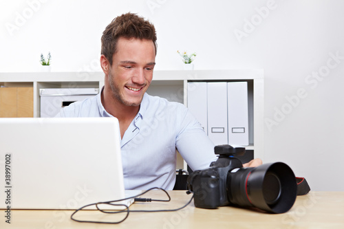 Profifotograf mit Kamera am Laptop