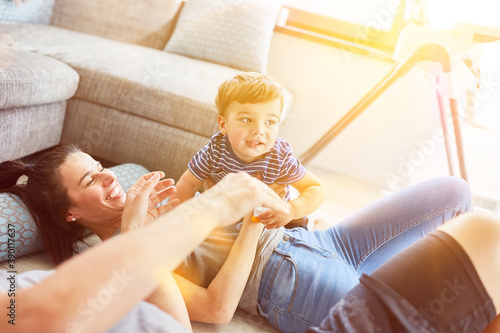 Glückliche Familie mit Kind liegt im Wohnzimmer