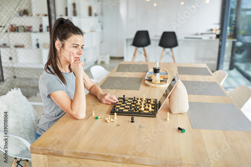 Frau zu Hause beim Schach spielen am Laptop Computer