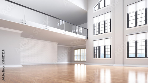Minimalist bright empty room with large windows and open space