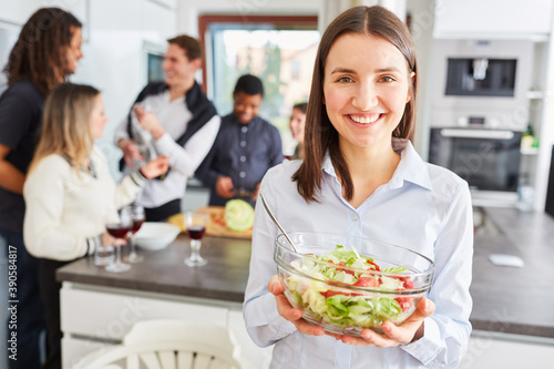 Lächelnde Frau in Küche mit Freunden hält Schüssel frischen Salat in Händen