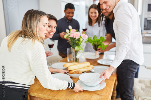 Friends set table with dishes for eating together