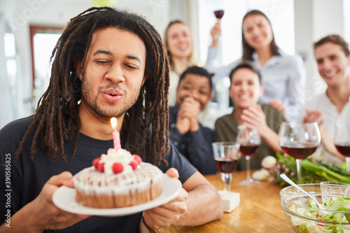 Mann beim Auspusten von Kerze auf Kuchen bei Geburtstagsfeier mit Freunden