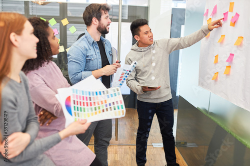 Grafikdesigner Team diskutiert über Farbgestaltung