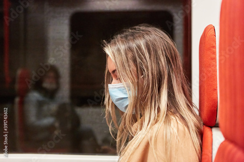 Frau als Fahrgast mit Mundschutz wegen Covid-19 Pandemie