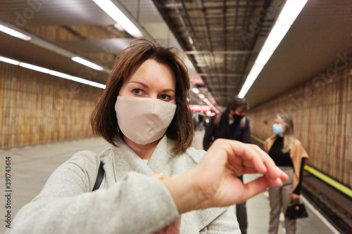 Pendlerin mit Maske wegen Covid-19 winkt zur Begrüßung