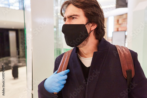 Reisender mit Mundschutz schaut auf die Uhr im Flughafen
