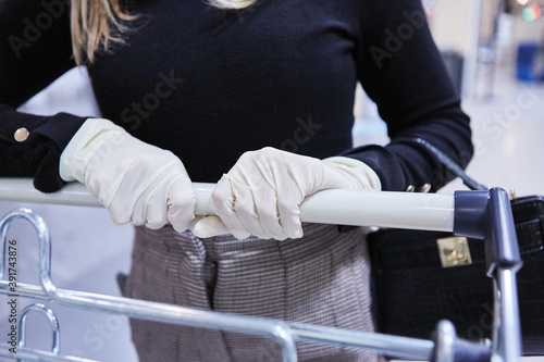 Hände in Einweghandschuhen schieben Einkaufswagen