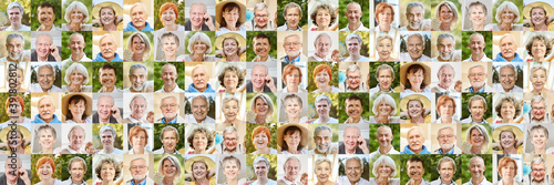 Panorama of adult people of many age groups in front of colorful backgrounds