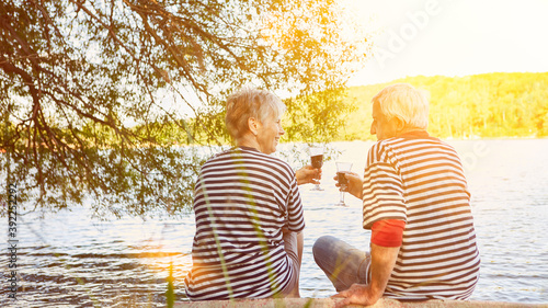 Senioren stoßen an mit einem Glas Weißwein und feiern zusammen Geburtstag