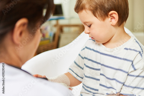 Kinderarzt bindet Mullbinde um Handgelenk von Kind