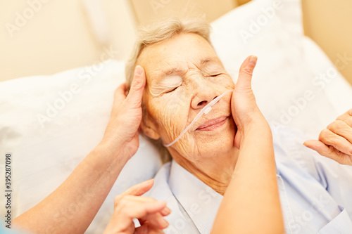 Alte Frau mit Sauerstoffbrille im Pflegeheim