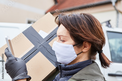 Paketbotin mit Mundschutz und Annahme Bestätigung