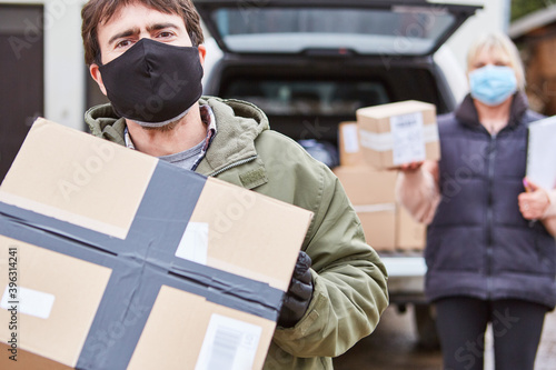 Paketbote mit Mundschutz verlässt sein Fahrzeug
