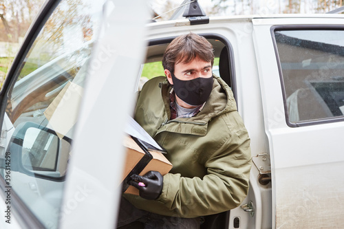 Paketbote mit Mundschutz verlässt sein Fahrzeug