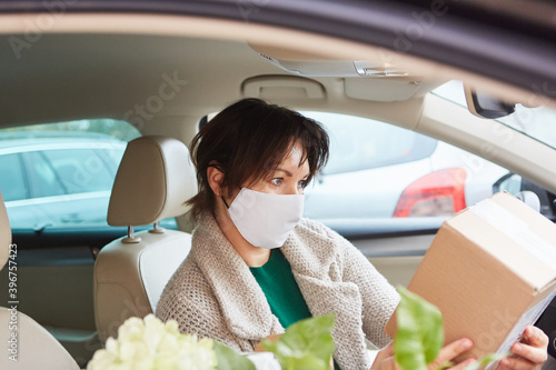 Auto Fahrerin mit Mundschutz macht Anruf als Bringdienst