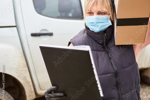 Lieferdienst Paketbotin mit Mundschutz liefert Paket aus