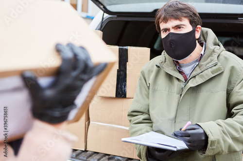 Lieferdienst Paketbote mit Mundschutz bei der Arbeit