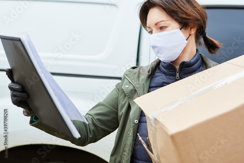 Paketbotin mit Mundschutz und Annahme Bestätigung