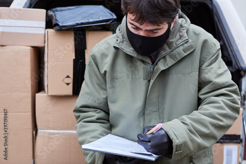 Paketbote mit Mundschutz prüft Lieferungen vor Laderaum