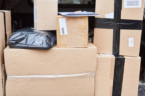 Unordnung im Keller oder Lagerraum mit vielen Kartons
