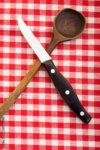 Barbecue utensils with fresh vegetables on a red checkered tablecloth