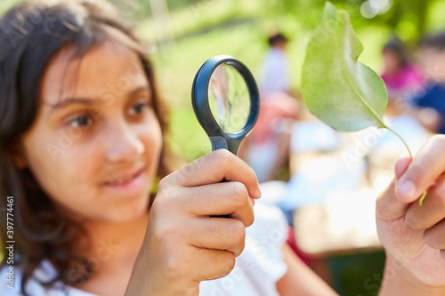 Mädchen betrachtet neugierig Blatt durch eine Lupe
