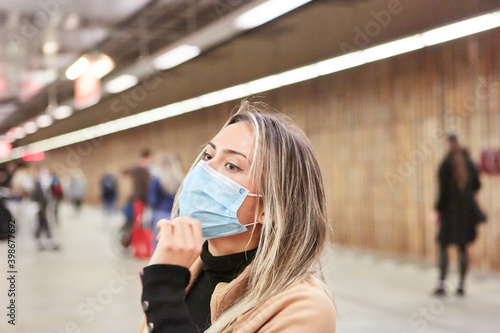 Commuter with face mask in the train station when mask is required