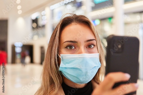 Touristin mit Mundschutz macht ein Selfie bei Covid-19