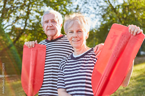 Glückliches Senioren Paar mit Ruder im Sommer