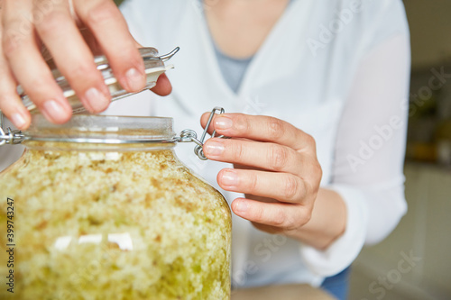 Frau mit im Supermarkt kauft Glas mit regionalem Produkt