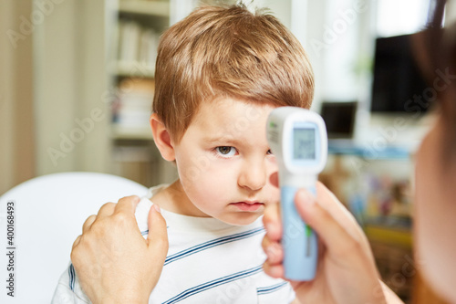 Kinderarzt beim kontaktlos Fieber messen