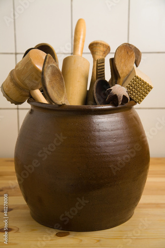 Regal in Küche mit Geschirr und Löffel als Hintergrund Header