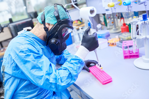 Forscher mit Vollmaske arbeitet im Labor an Covid-19 Impfstoff