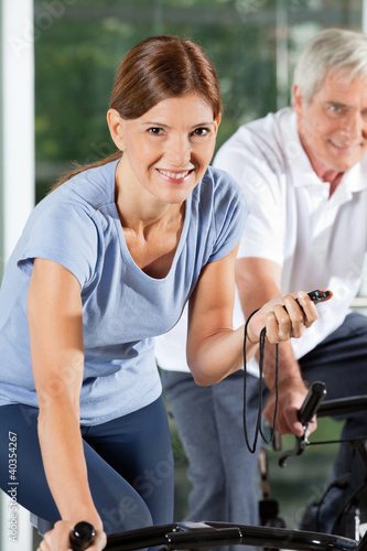 Lachende Frau mit Stoppuhr im Fitnesscenter
