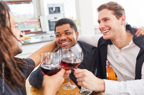 Fröhliche Männer als Freunde beim stoßen mit Glas Wein in Küche an